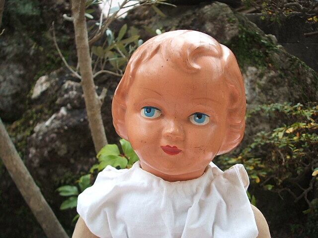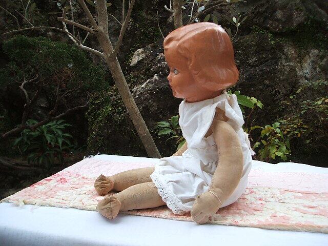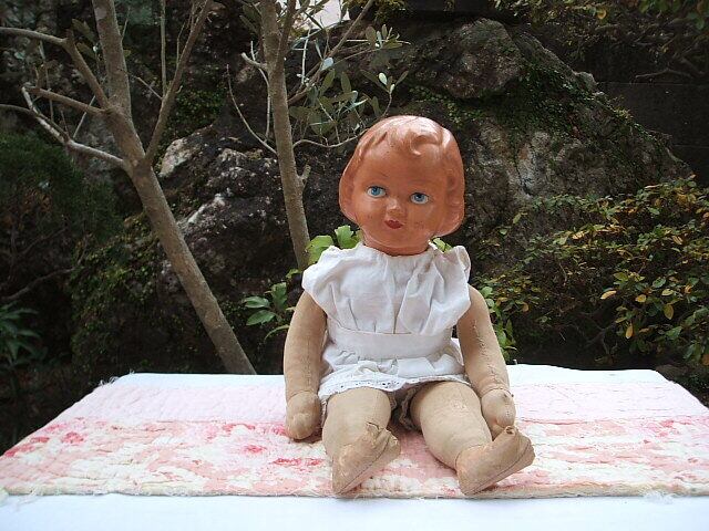 イギリスのロンドンで見つけた1900年代のお人形です。見つめるブルーの目に引き付けられます。お顔の部分は陶器で下の部分は布製です。靴の部分はビニール製です。お顔の陶器の部分は経年のため乾列がありますが問題はありません。左足と腕に手縫いの修理が見られます。レース付きのお手製の白のお洋服付です。とても趣のあるドールです。