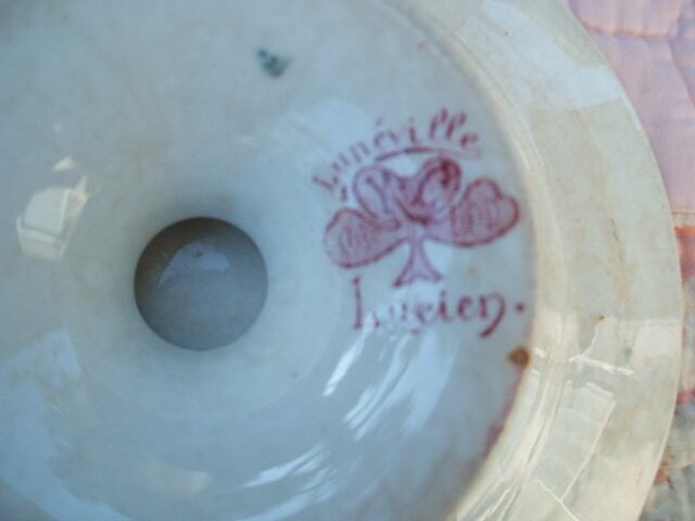 フランスのLoire地方のSaint-Chamondで見つけたLunevilleのLucienシリーズのかわいいコンポートです。赤で三つ葉、四葉のクローバーの図柄がとてもおしゃれでかわいいです。1900年代と古いお品ですのでお写真で見られるシミ等がありますが実際にお使いいただけます。見えないところに1ミリほどの傷があります。フランスらしいレアでshabby chicなお品です。