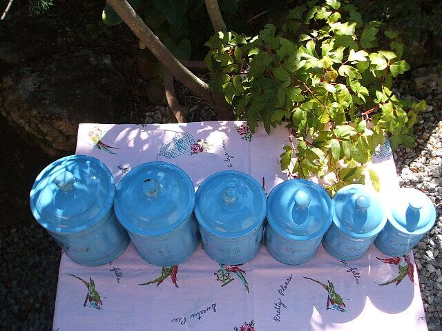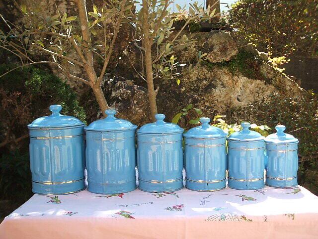 西フランスの Poitou-Charentes地方で見つけたスカイブルーにゴールドの文字がとてもチャーミングなホーロー製のスパイスコンテナーです。お写真で見られる傷等は多少はありますが全体的に良いコンディションです。6こセットです。