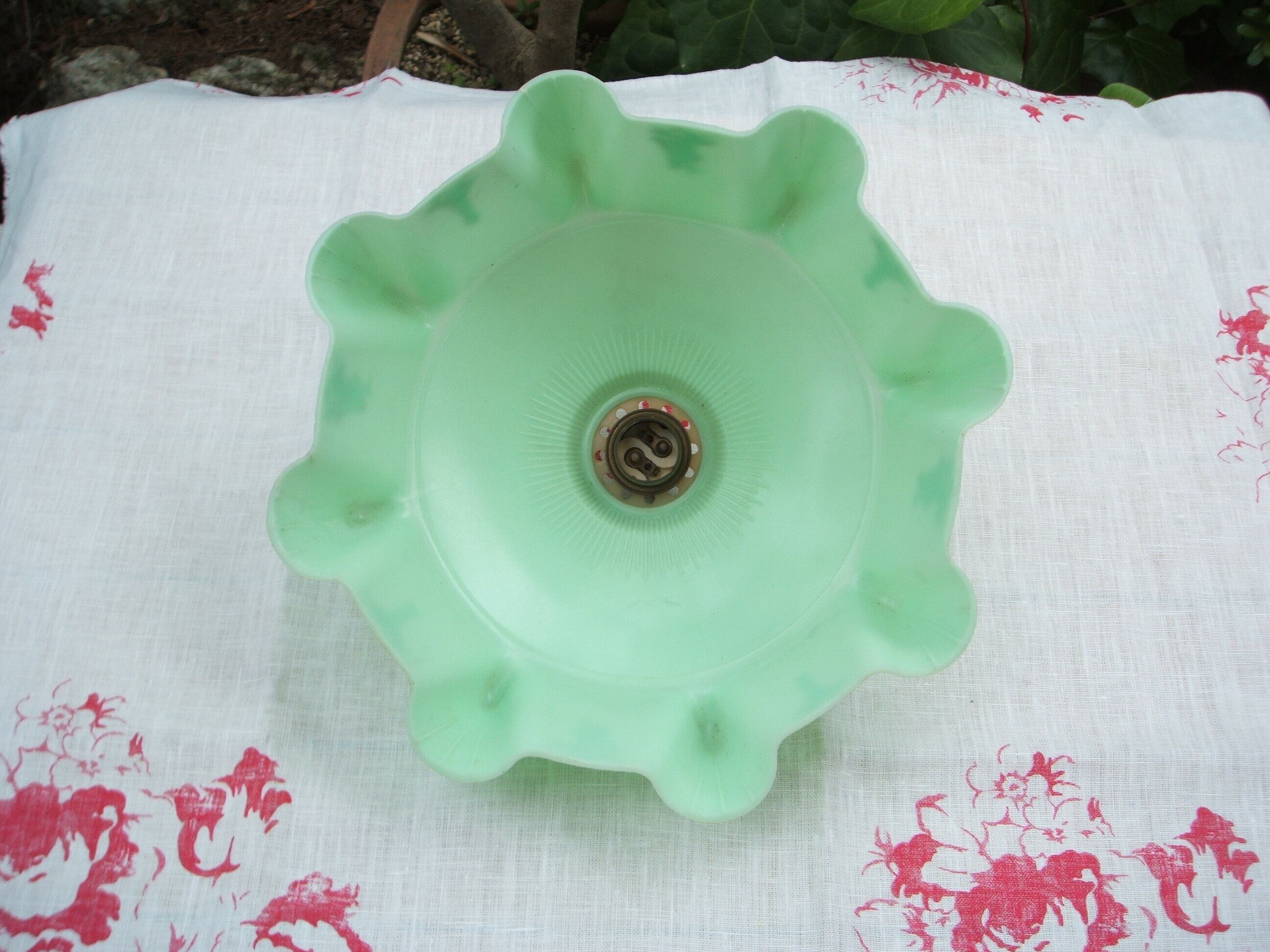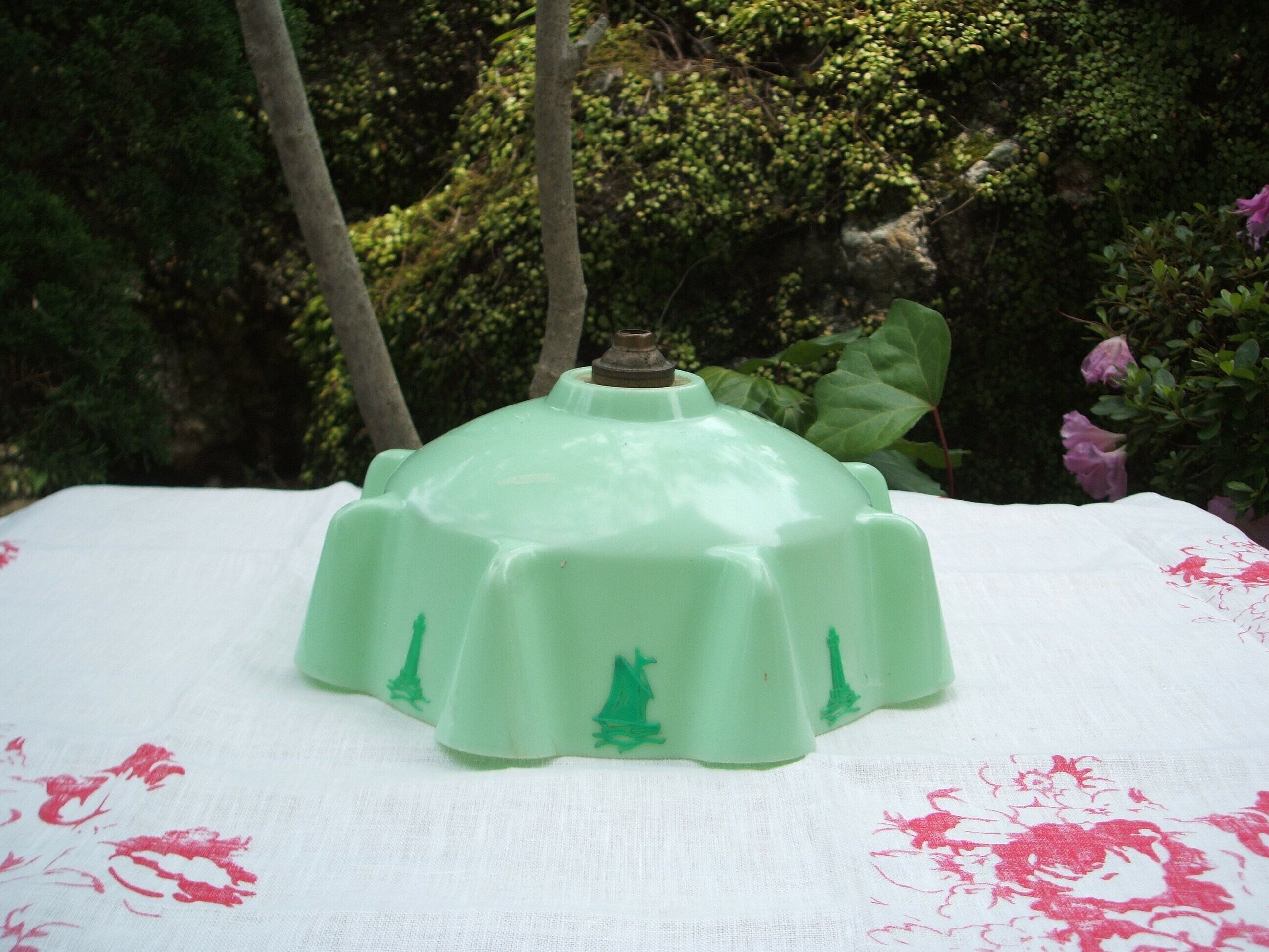 お色は優しいペパーミントです。ヨットと灯台柄が入り・・・・・とても涼しげでかわいいランプシェードです。1ケ所亀裂がありますが、修理しております。お使いになられる際には問題ないかと思います。素材はプラスティック製です。中に電球が入るとほんのり柔らかい感じになります。