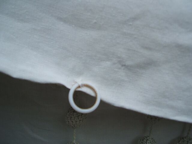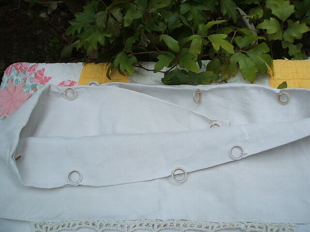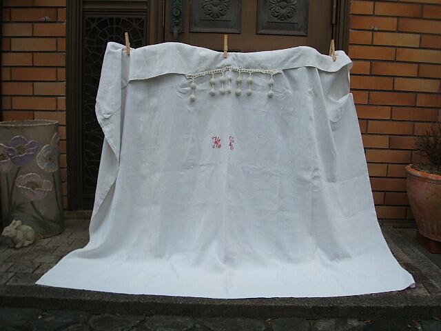 フランスのパリで見つけたとてもshabby chicなカーテンです。中央部分に赤の刺繍でモノグラムと手つくりのポンポンが7個ついています。上の部分にプラスチック製のカーテンフックがついています。そのまま掛けてお使いいただけます。素材はメチィスかと思います。ハンドメイドのフランスの南仏を思わせるおしゃれなカーテンです。目隠しとしてもお使いいただけます。モノグラムの右上に小さなシミと補修の部分がありますがそのほかは破れなく良い状態です。お写真でご確認ください。