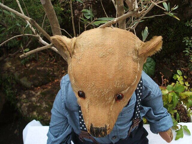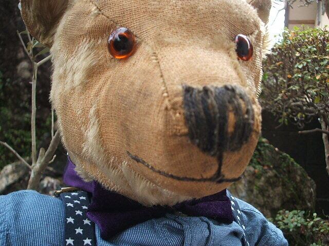 イギリスのロンドンでも見つけたHuge Teddy Bearです。目はアンバー色です。購入時からおしゃれなお洋服を着ていましたのでこのままで出品いたします。経年のためモヘアが抜けた部分があります。手と足の裏はフェルトで修理されています。蝶ネクタイとおズボン着用が何ともお茶目です。また、ここまでの大きさの古いTeddy Bearはとてもレアです。