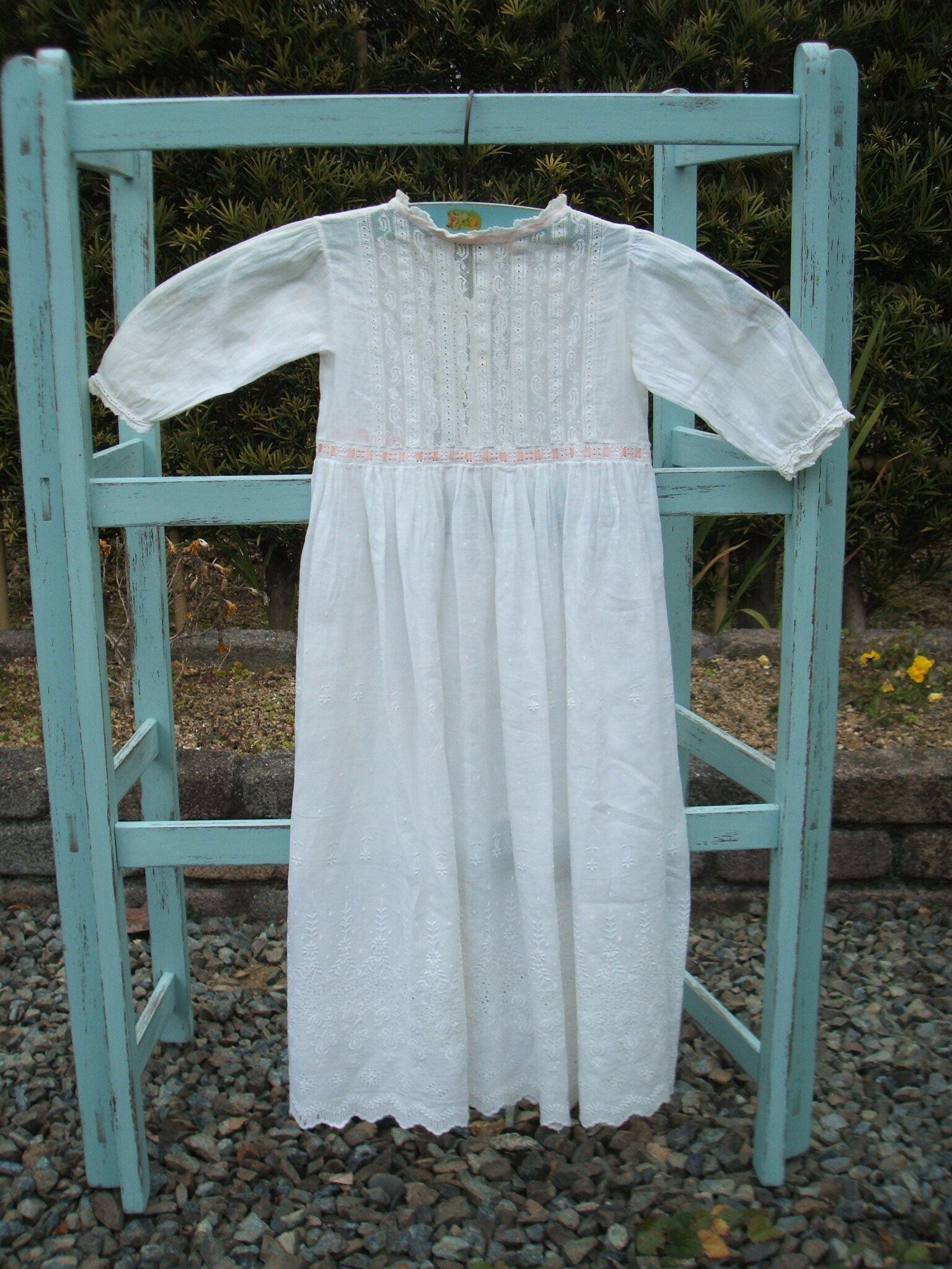 イギリスのロンドンで見つけたvictorian baby dressです。とても繊細なコットンにレースやピンクのおリボンが施されたとてもかわいいbaby dressです。大切なお人形さんに・・・お部屋のディスプレイとしても・・・とてもかわいいドレスです。 シミ等もなくとても良いコンディションです。 No.AK 200836 ■size:身幅49cm,袖丈:19cm,丈:62cm ■ good ■UK 1930年代