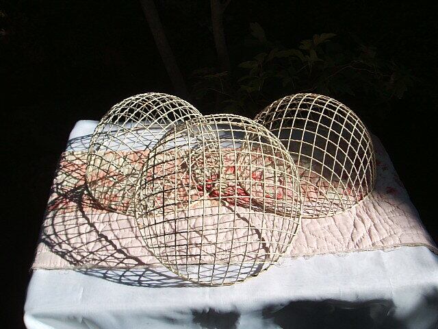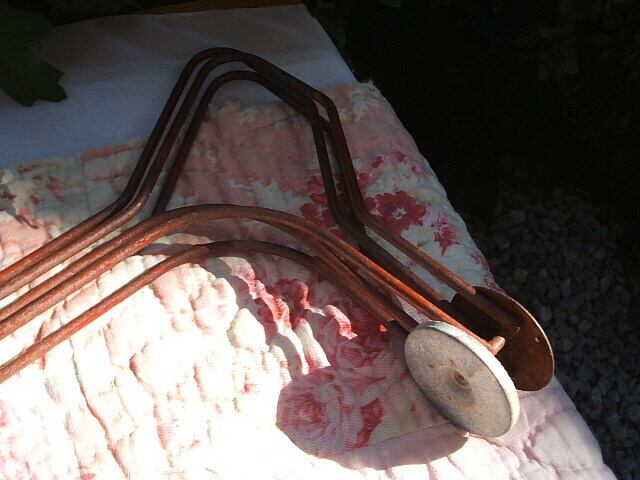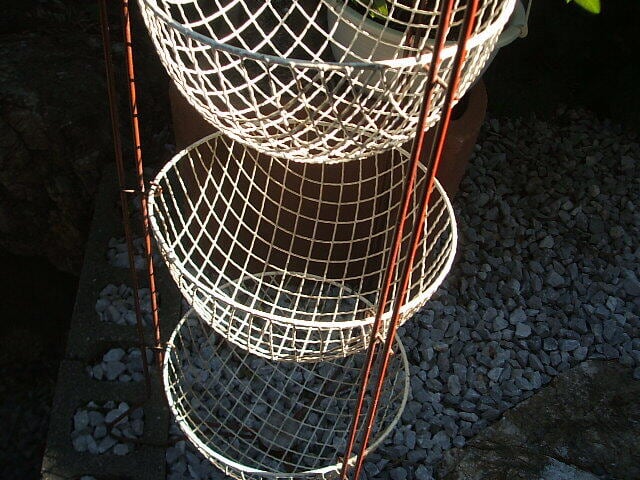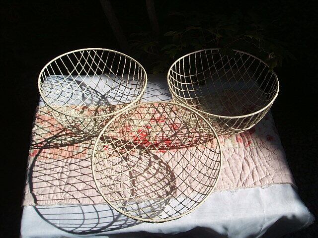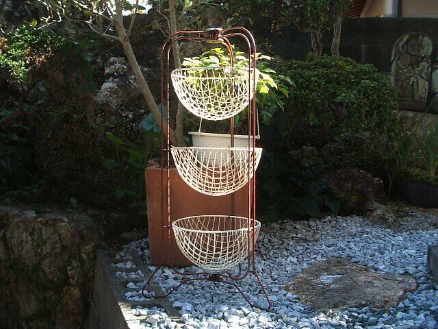 かごはメタルにプラスチック製のカバーがされています。かごの白いプラスチックが取れたところが数か所あります。が凹み等はありません。実際にお使いいただけるお品です。レトロな野菜ラックが何ともおしゃれでshabby chicです。