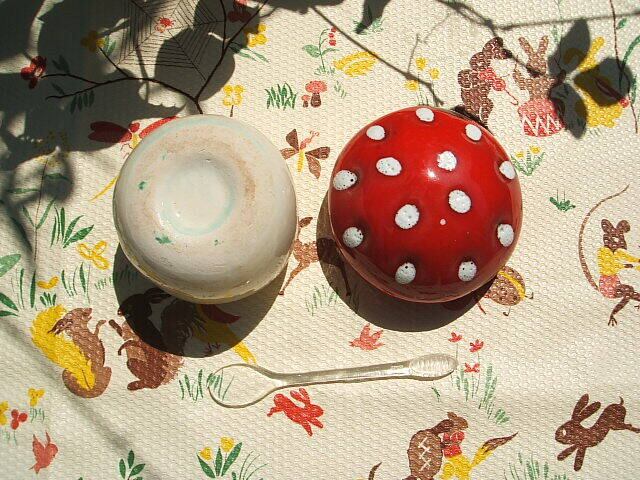 フランスのパリで見つけたかわいいウサギの調味料入れのセットです。マヨルカ調のグリーンのお皿にかわいい違うシェイプのうさぎとかわいいマッシュルームがとてもかわいいセットです。マッシュルームの縁と蓋の裏に小さなキズが見られますが他は良い状態です。おそらくハンドメイドのお品かと思います。