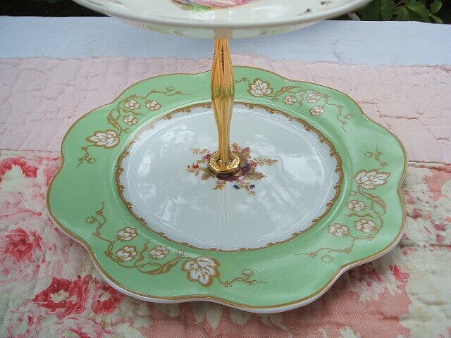 イギリスのロンドンで見つけたかわいいケーキスタンドです。かわいい組み合わせです。下のお皿はegg duck green色にスカラップ上の段のお皿はピンクのドレスを着たレディのモチーフです。状態も欠けなく良い状態です。上のお皿の金色のお花のモチーフに薄くなった部分があります。プチフールやチョコレートを置かれてお茶の時間にいかがですか?