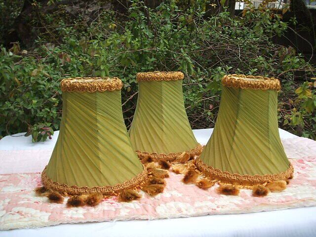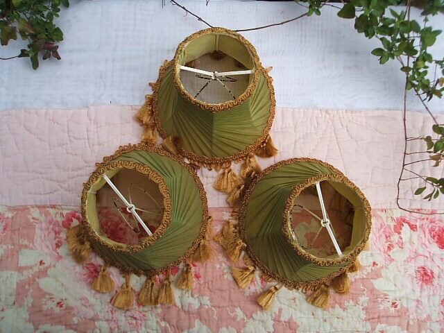 イギリスのロンドンで見つけたプリーツシフォンのランプシェードです。お色はシックなグリーンに金茶のフリンジがマッチしておりシャトーを感じさせ上品な雰囲気です。コンディションもよいです。1つのランプシェードの内側に小さな破れがありますがお使いになられる分には支障はありません。お写真でご確認ください。