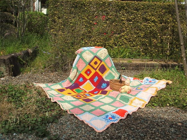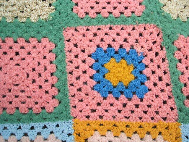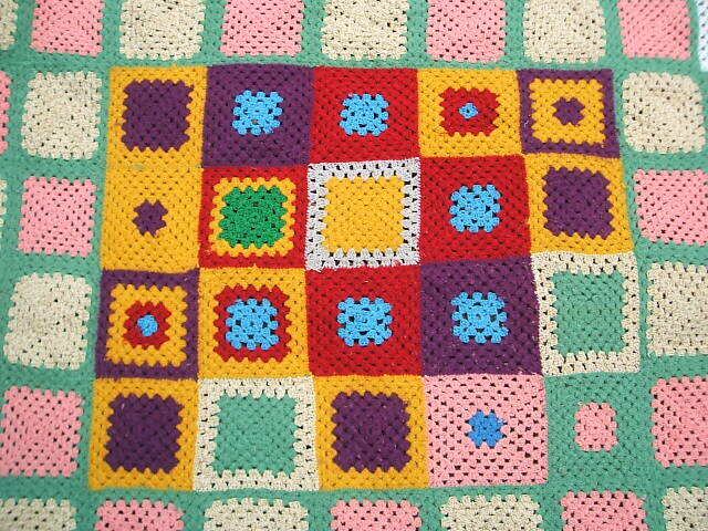 イギリスのロンドンで見つけたレトロ感満点のcrochetです。クロッシュの中央は黄色や赤で編まれ周りは優しいお色で編まれた正方形のクロッシュです。シミ等はありませんがウールの毛糸がシュリンクしたパーツがあります。画像でご確認ください。ベッドやソファに掛けてお使いいただけます。とてもshabby chicなcrochetです。
