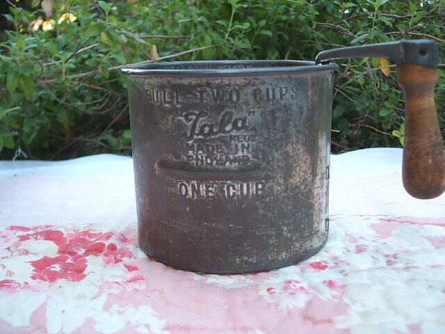 イギリスのロンドンで見つけたTalaのフラワーシフターです。古い形の手動式です。1cup,2cupのメモリ付きです。持ち手は木製です。アルミ製です。錆はありません。実際にご使用できなくはないと思いますが、ディスプレイとして・・・とてもshabby chicなお品です。イギリス製です。 No.AK 2001292 ■size:8,5cm底直径x8cm高x13,5cm上幅 ■condition:very good ■UK 1940年代