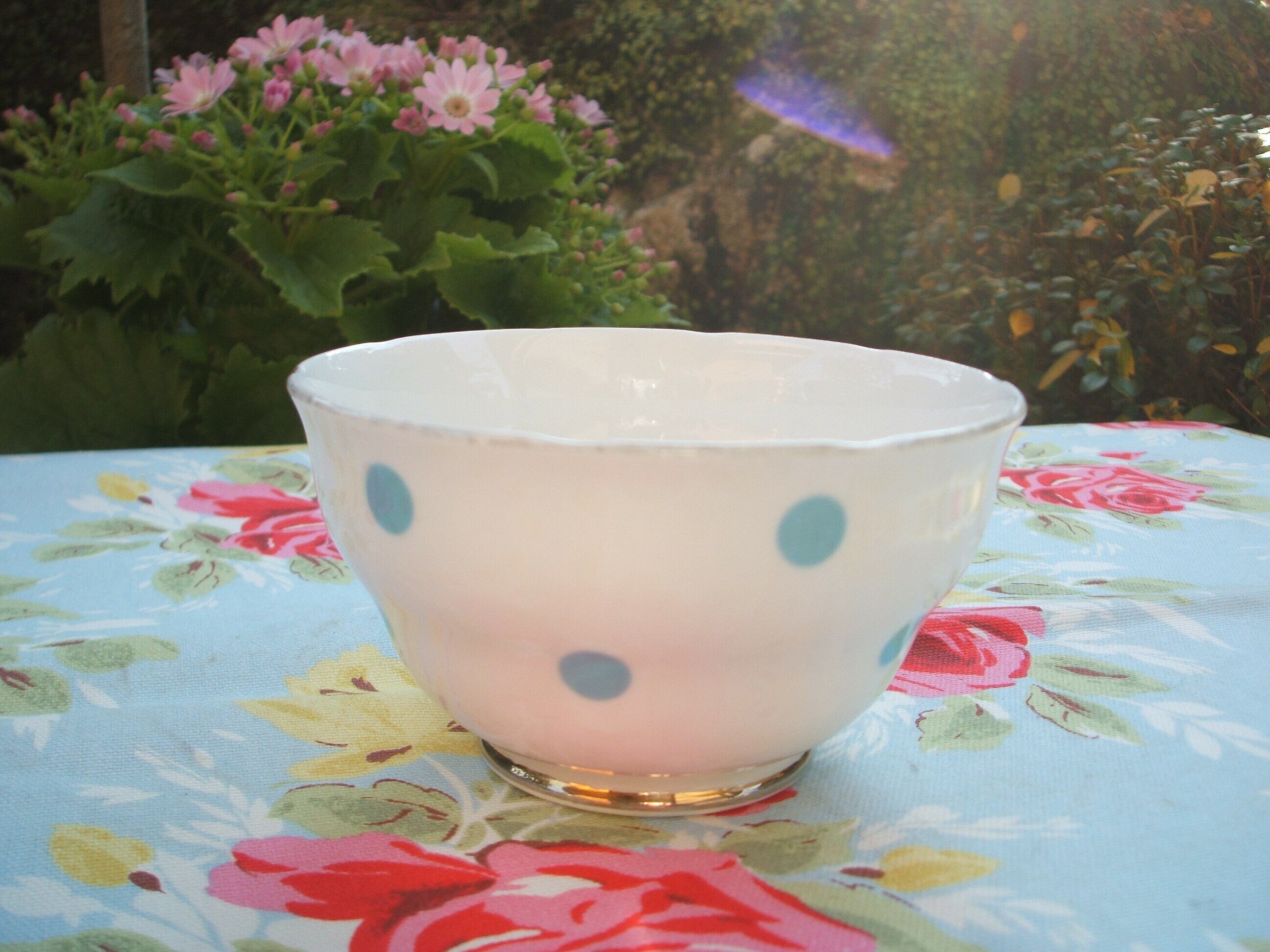 イギリスのロンドンで見つけたsugar bowlです。白にブルーのドットがかわいいです。sugar bowlだけでなく、用途もいろいろにお使いいただけます。裏にRoyal Valeの刻印があります。欠け、亀裂なく良いコンディションです。 どんなtea setsにも合うsugar bowlです。 No.AK 200765 ■size:11cm直径x5,5cm高 ■condition:very good ■UK 1950年代