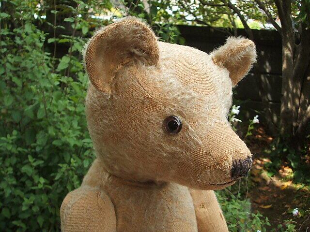イギリスの北にある海沿いの町Lowestoftで見つけたかわいいvintage teddy bearです。大変古いものですのでモヘアは抜けた部分があります。またお鼻の横、足と手の裏は修理されています。お首の後ろもうなだれないように固定されています。1900年代ととても古いベアですが比較的良いコンディションです。