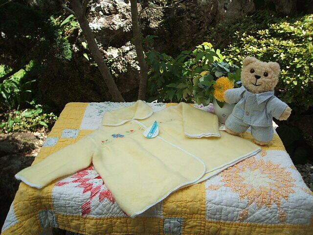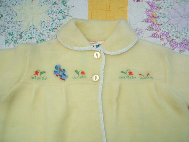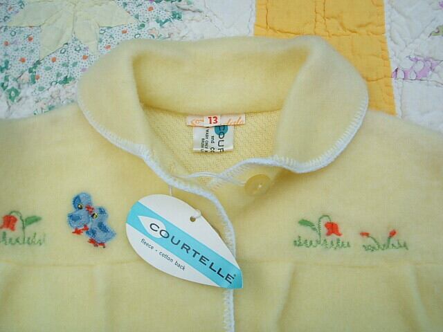 イギリスのロンドンで見つけたベビー用のフリース製のは織物です。新品のデッドストックです。胸のところにかわいい鳥の刺繍があります。前ボタン2つで脱ぎ着も簡単でこれからの時期に最適です。優しい黄色で女子でも男の子でもどちらも大丈夫です。 No.AK 2001098 ■size:13months ■condition:New ■U.K 1960年代