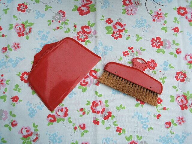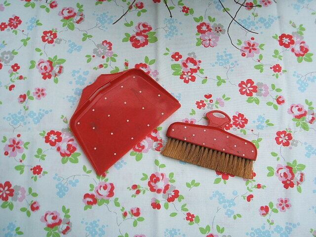 イギリスのロンドンで見つけたテーブル用のブラシセットです。赤にドット柄がとてもかわいいです。テーブルだけでなく細かい部分等のお掃除にお使いいただけます。お部屋のデコレーションとしてもかわいいですね。良い状態ですがお皿の角に小さな欠けがありますが、目立つものではありません。問題なくお使いいただけます。とてもshabby Chicなお品です。