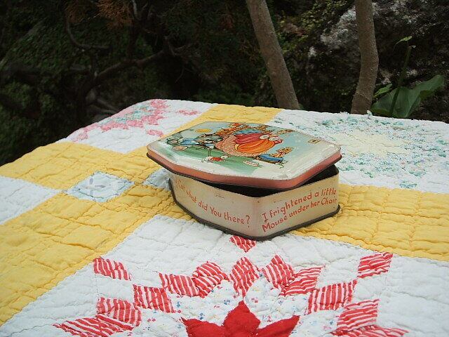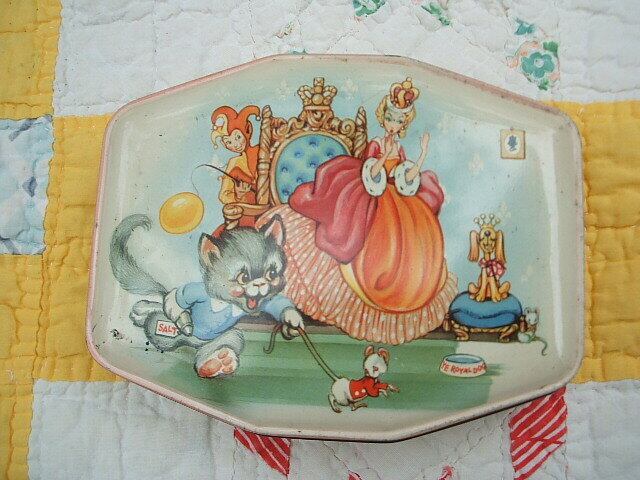 イギリスのロンドンで見つけたかわいいアルミキャンディー缶です。子ネズミを捕まえたかわいい猫とそれを見守るクイーンとロイヤルドッグや箱の周りのは英語で猫ちゃんどこに行くの?等の言葉えがかれたお茶目な缶です。イギリスのHORNER社の缶です。中にキャンディーが入っていたものです。小物入れに・・・ディスプレイに・・・