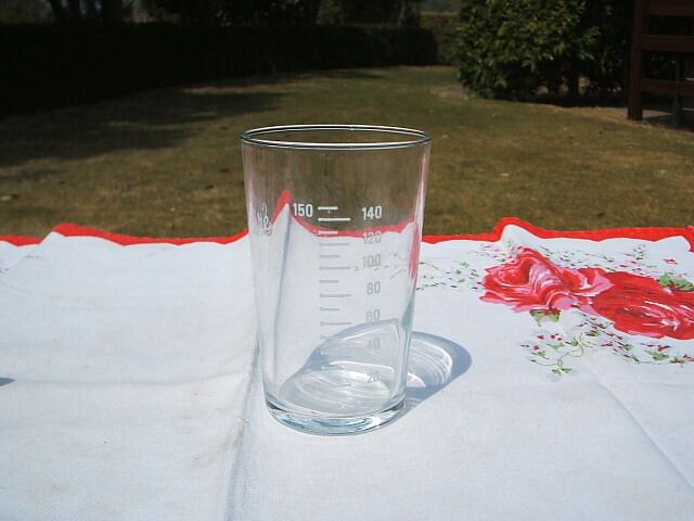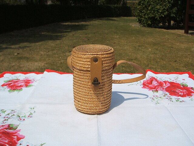 フランスのパリで見つけたvintage verre de cure です。1940年代の古いものです。フランスの温泉地、保養地等で飲料用として使われたスパグラスです。吹きガラスSt.Nectaireの文字と150ccの目盛り付きです。バスケットケース付きで持ち運びできます。持ち手はレザーです。