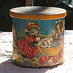 イギリスのロンドンで見つたとても古いアルミ缶です。猫の家族の絵がとてもかわいいです。ボタン入れ・・・その他・・小物入れとして・・・キャンディーを入れても・・・・とてもかわいいアルミ缶です。経年のため蓋の部分に錆等ありますが、shabby chicなレアなお品です。 No.AK 200985 ■size:10cm直径x9cm高 ■condition:very good ■UK 1940年代