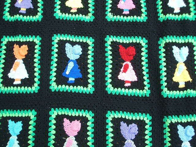 フランスのパリで見つけたアメリカンヴィンテージクロッシュです。パッチワークでお馴染みのスーちゃんが編まれています。アメリカならではのお品です。黒地にカラフルスーちゃん、縁取りはグリーン系の濃淡でステキです。ベッドカバーとしてお使いいただけたらピッタリと思います。コンディションも多少の毛羽立ちはありますが、破れ等なく良い状態です。とてもかわいいアフガンクロッシュです。