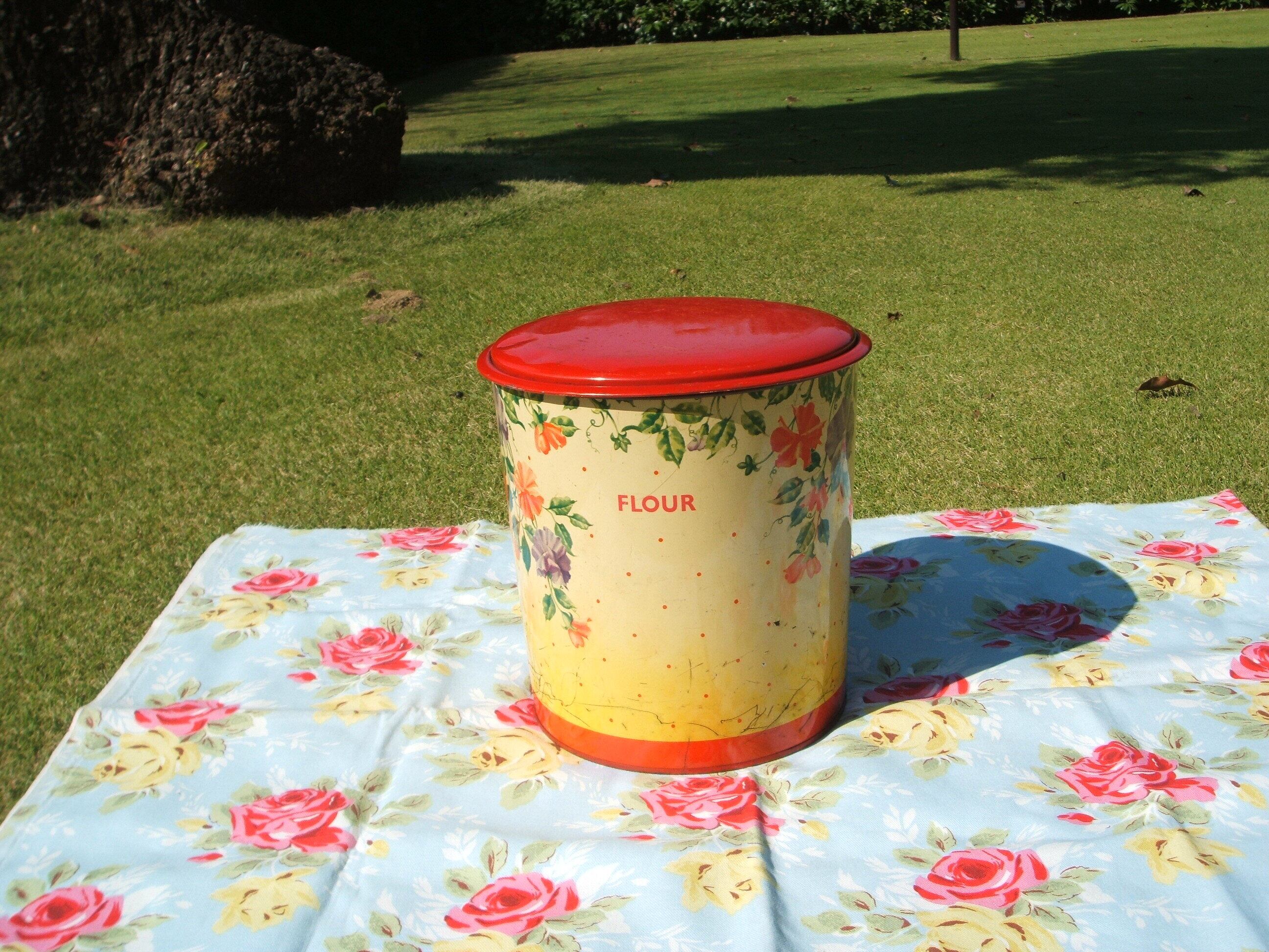 イギリスのロンドンで見つけたshabby chicなHANDIWARE flour tinです。クリームにカワフルなお花、真っ赤なお色の蓋がとてもかわいい缶です。蓋に小さな凹みがありますが、殆ど気になりません。下の部分にひっかき傷のようなものがあります。お写真でご確認ください。内側は綺麗ですので、まだまだお使いいただけます。良い状態です。