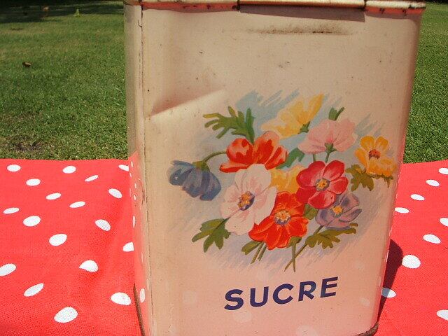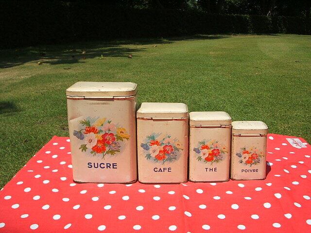 フランスのLimousinで見つけました。表裏の絵柄が異なり、おしゃれです。クリーム色にブーケとクジャク?の絵柄がステキです。 全体的に状態もよく、もちろん実際にお使いいただけます。SUCREの缶に少し凹みがあります。 フランスらしい、とてもかわいい缶セットです。 No.AK 200498 ■size:11,5cm高x8cmx6,5cm底の部分 ■condition:very good ■France 1950年代