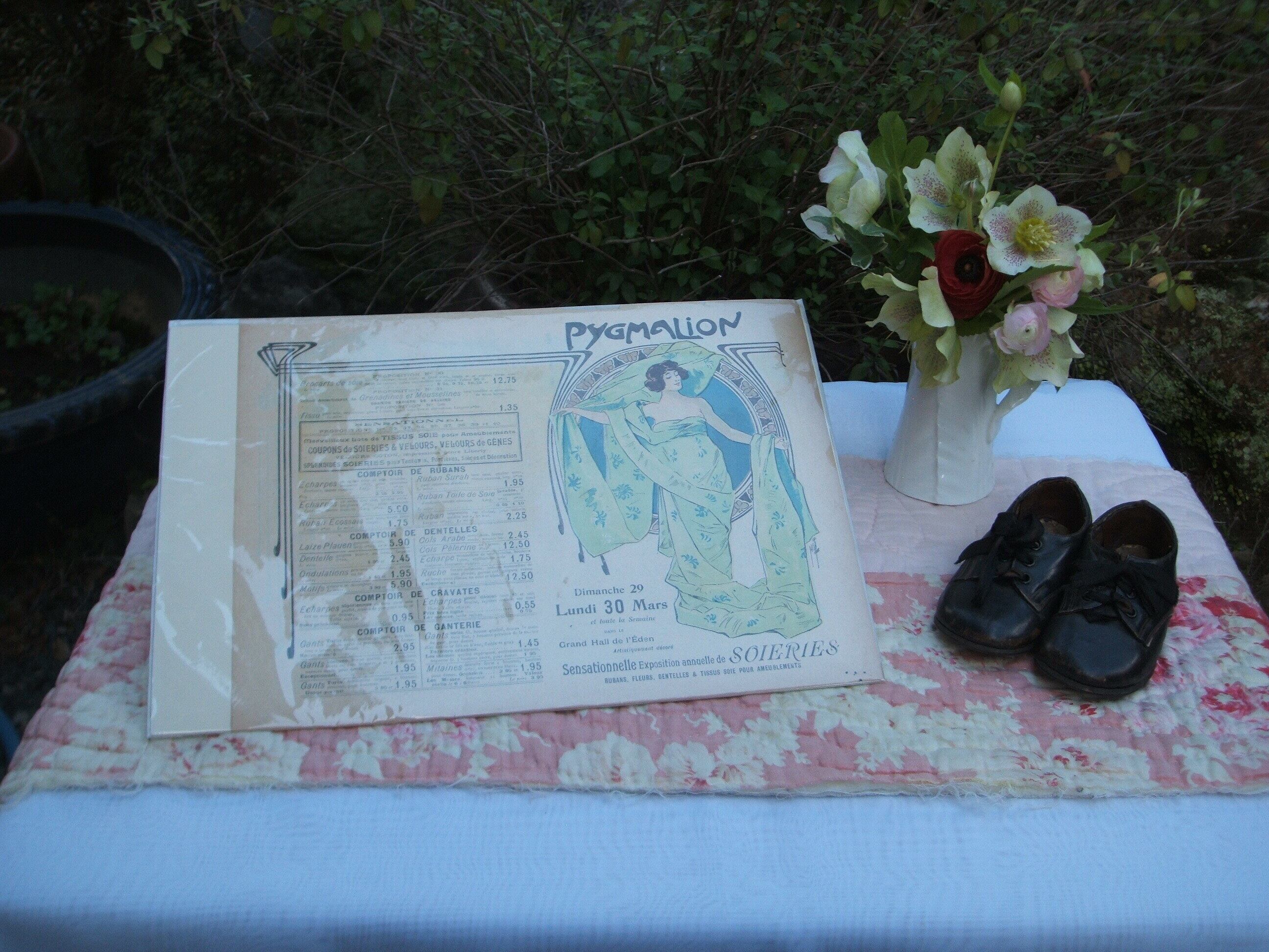 イギリスのロンドンで見つけたPYGMALIONというシルク展の案内です。19世紀末から20世紀初頭に掛けて開花したアールヌーボー期のものです。アールヌーボーの特徴が出たプリントです。額に入れるとステキな一枚になります。プリントの上の部分にダメージがありますがそれもまた雰囲気が出ていい感じです。 No.AK 2001351 ■size:23,5cmx30,5cm ■condition:good ■France 19世紀末から20世紀初頭