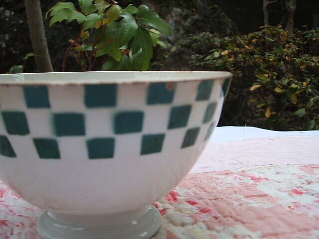 フランスのパリで見つけたグリーンの市松柄のカフェオレボウルです。個人的にフランス代表柄ともいえる市松柄が大好きです。グリーンお色も光によって暗く映るときも明るめに映るときもあり、ほかのものとも合わせやすいと思います。台にも欠け等ありません。中にお写真で見られるヘヤーが3cmほどあります。ステキなカフェボウルです。 No.AK 2001183 ■size:13cm直径x7cm高 ■condition: good ■France 1920年代
