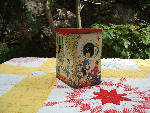 イギリスのロンドンで見つけたアルミ缶です。レトロな感じの絵が目を引きます。ディスプレーとしてソーイングの物入れや紅茶缶などに・・・缶の表面と中にシミやさびが見られますが間違いなくshabby chicなお品です。 No.AK 2001124 ■size:10cmx7,3cmx10,2cm高 ■condition:good ■UK 1940年代