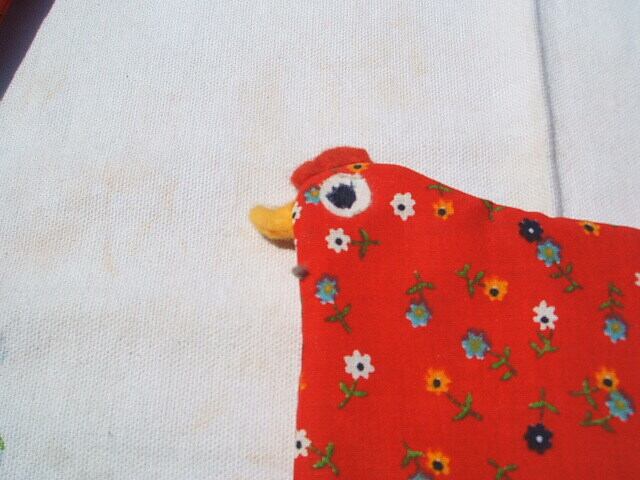 イギリスのロンドンで見つけたかわいいhand made egg cozyです。お茶目なニワトリが何ともかわいいです。vintageの赤地フワワープリントに白のレース・・・鶏冠もちゃんと付いています。シミ、いたみなくとても良い状態です。 とてもかわいいegg cozyです。 No.AK 200589 ■size:8,5cmx9cm ■condition:very good ■U.K 1960年代